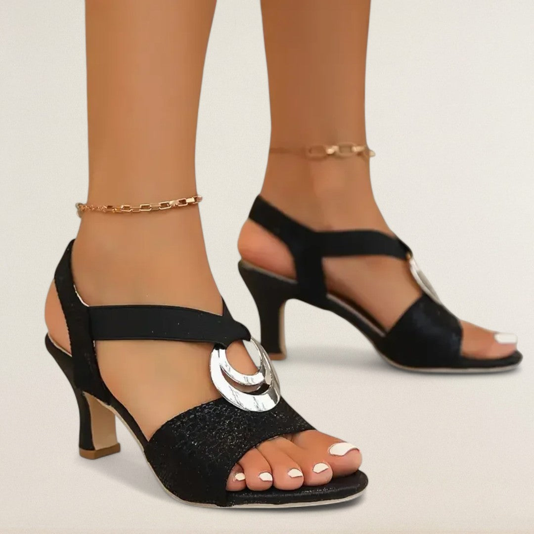 Stilvolle Sandalen mit einem dezenten Absatz kombinieren modernes Aussehen mit Fokus auf Komfort. Dank der weichen Sohle und der stabilen Konstruktion bieten sie den ganzen Tag über Unterstützung. Das dekorative Metalldetail verleiht den Schuhen einen markanten Charakter und passt sowohl zu Tages- als auch Abendoutfits. Die ideale Wahl für Frauen, die Komfort mit Eleganz kombinieren möchten.