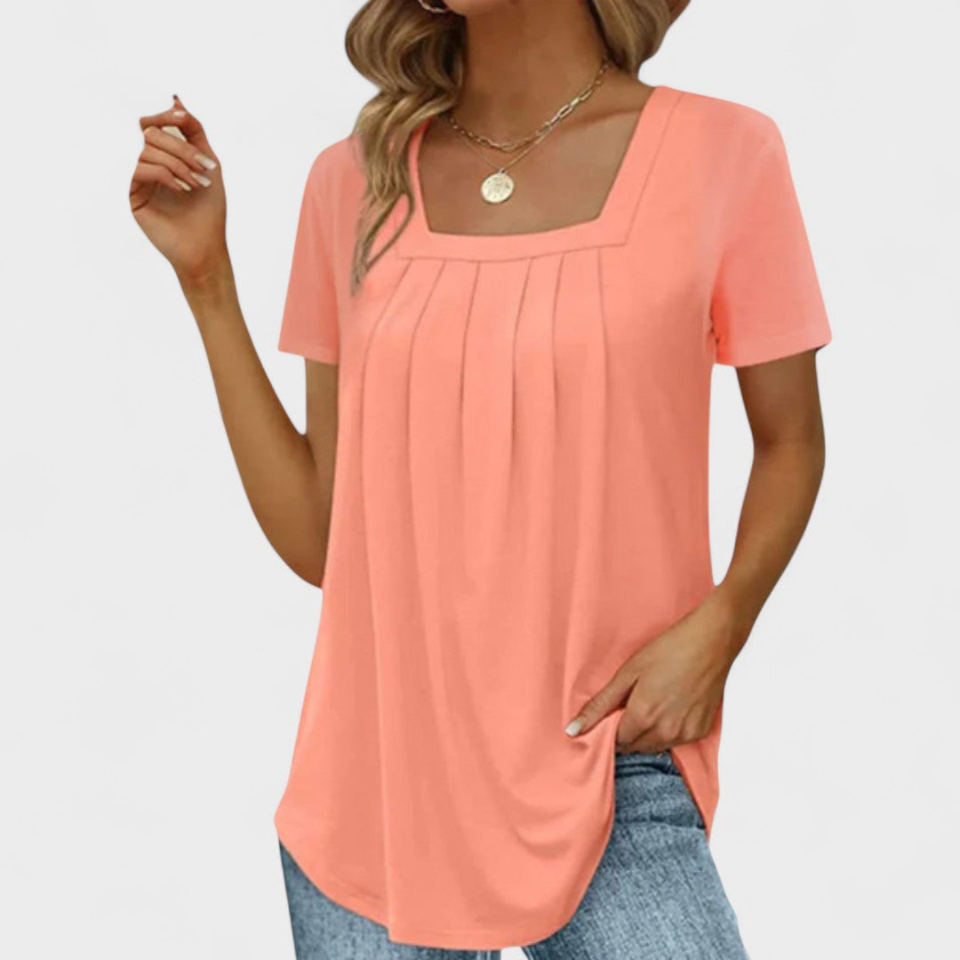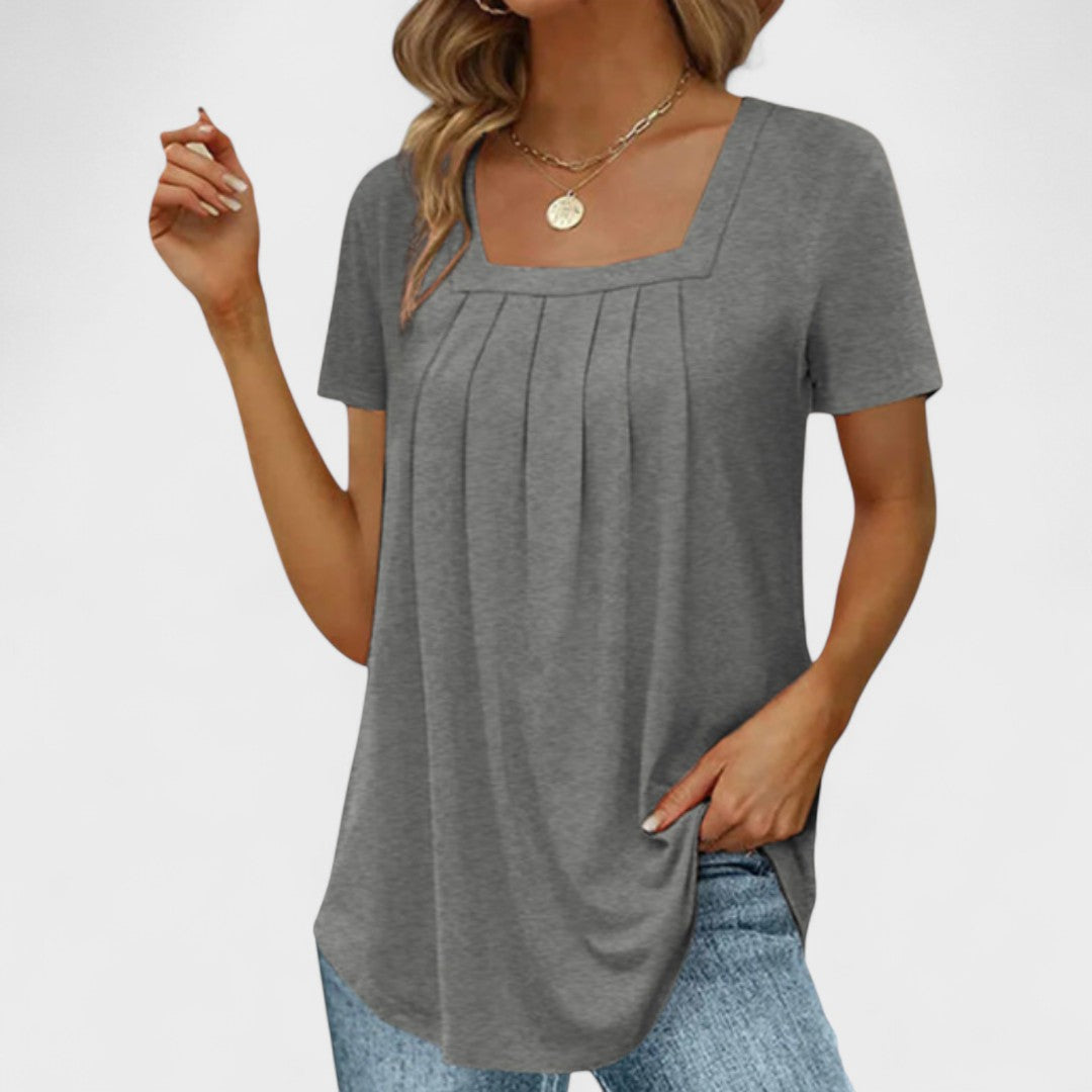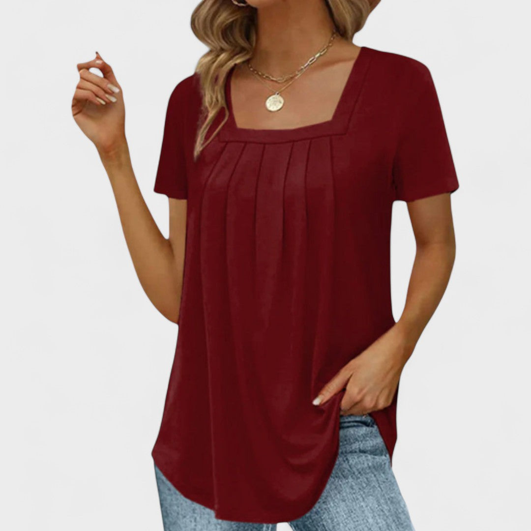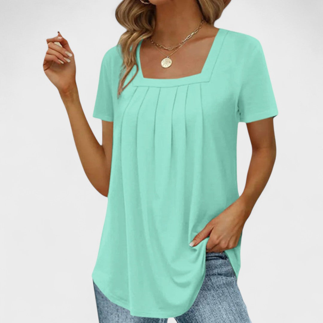 Die perfekte Balance zwischen Eleganz und Komfort – diese Bluse mit kurzen Ärmeln bietet einen schmeichelhaften quadratischen Ausschnitt, umrahmt von feinen Falten für einen schön fallenden Effekt. Die lockere Passform sorgt den ganzen Tag für Komfort, während die präzisen Details sie zu einem vielseitigen Stück für sowohl legere als auch elegante Anlässe machen. Passt perfekt zu Jeans, Röcken und eleganten Hosen und ist eine zeitlose Ergänzung für jede Garderobe.