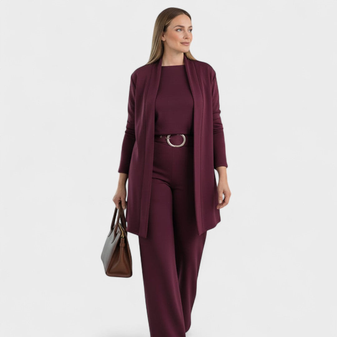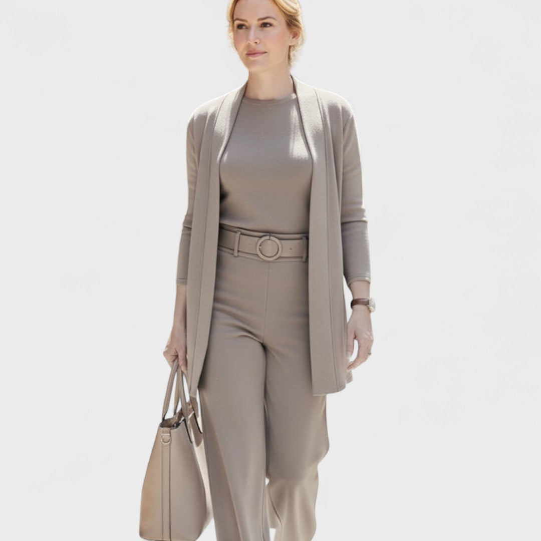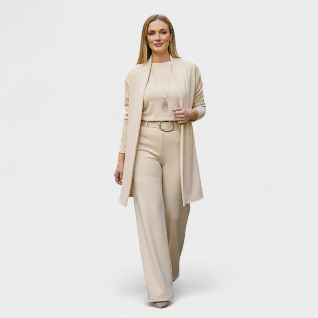 Dieses edle 3-Teile-Ensemble vereint zeitlose Eleganz mit modernem Komfort. Der feine Strickstoff schmiegt sich angenehm an die Haut, während der lässig fallende Cardigan und die perfekt geschnittene Hose eine klare, feminine Silhouette schaffen. Ob im Büro, beim Stadtbummel oder beim Abendessen – mit diesem Look sind Sie immer stilvoll gekleidet.