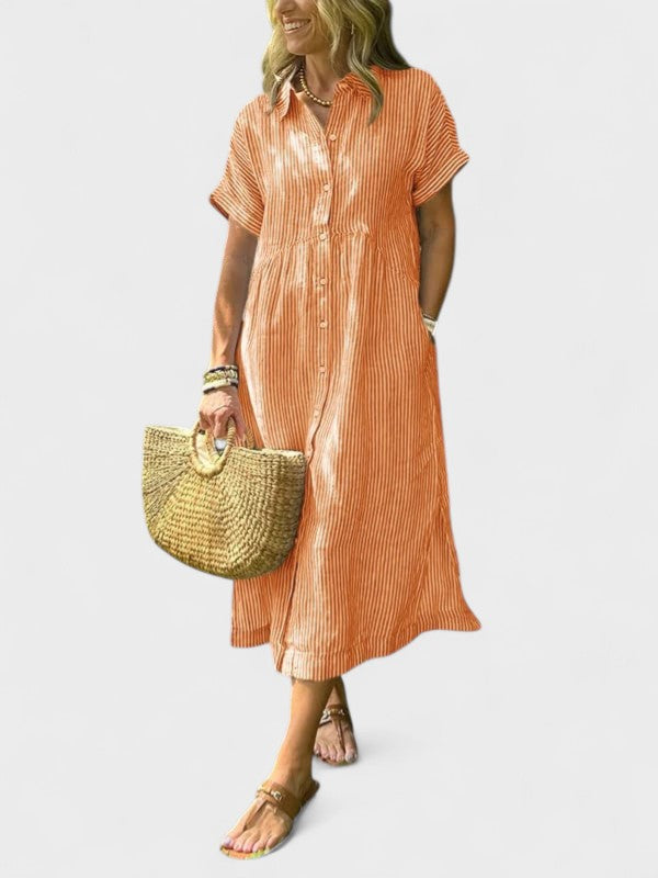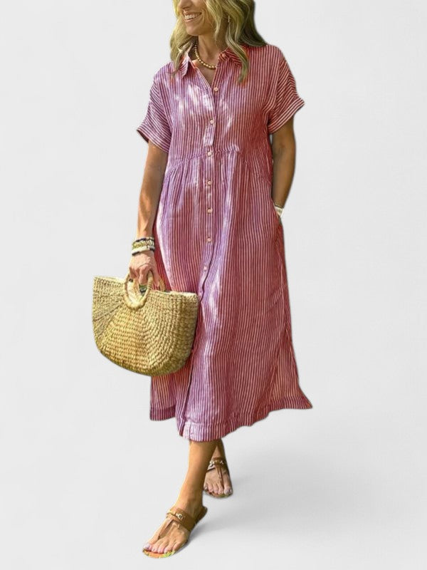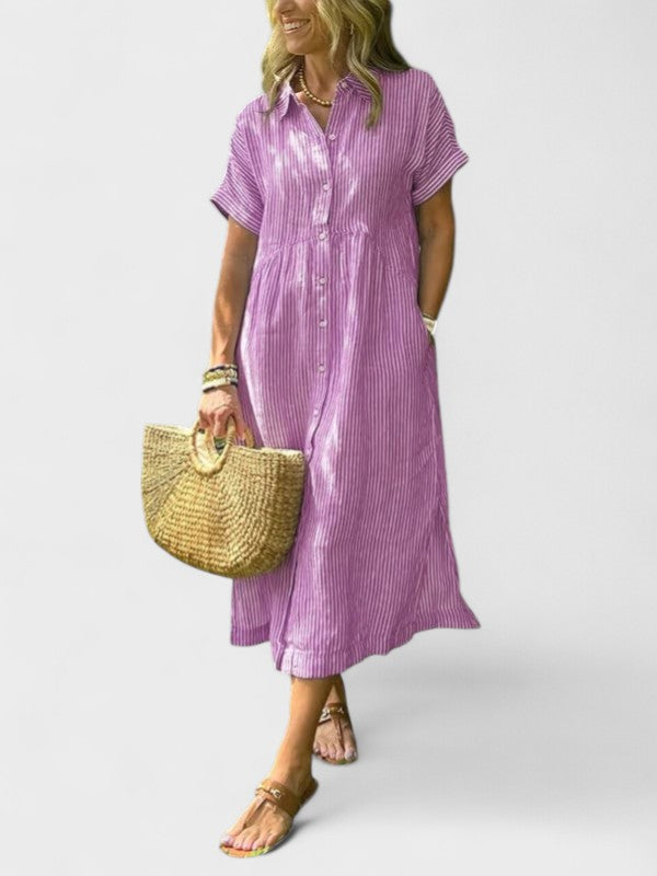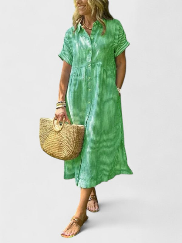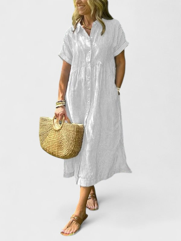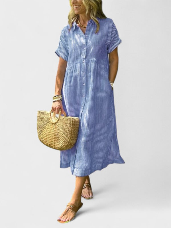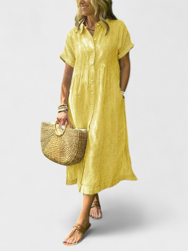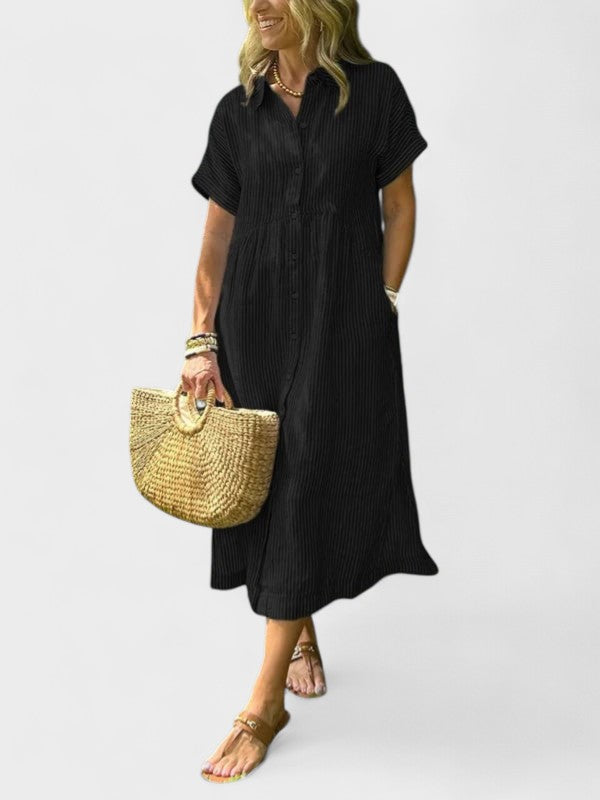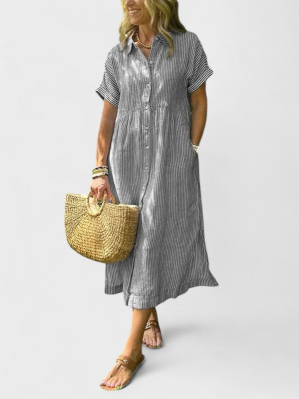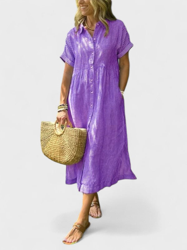 Treten Sie in die Saison mit diesem wunderschön lässigen Kleid ein, das ideal für stilvolle und angenehme Tage in der Wärme ist. Das Kleid ist mit einem luftigen, schmeichelhaften Schnitt und einer klassischen Knopfleiste vorne gestaltet, was ihm einen zeitlosen Touch mit einem Hauch von lässiger Raffinesse verleiht. Der leichte Stoff sorgt dafür, dass Sie sich kühl und komfortabel fühlen, sodass es eine perfekte Wahl sowohl für Gartenpartys als auch für Freizeitaktivitäten ist. Kombinieren Sie es mit Sandalen und einer geflochtenen Tasche für einen sofort stilvollen Look.