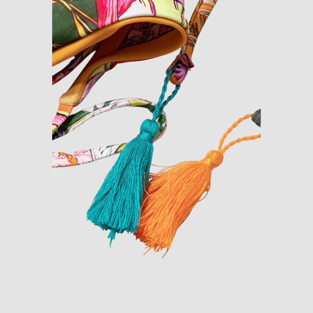 Entdecken Sie stilvolle Raffinesse und Originalität in diesem luxuriösen Bikiniset, das an ein Kunstwerk erinnert. Der elegante Schnitt des Tops in Tuchform und der untere Teil mit weichem Überkreuz und Fransen verleihen dem Outfit einen exotischen Touch. Es ist ideal für diejenigen, die am Strand oder am Pool mit einem einzigartigen und raffinierten Look strahlen möchten.