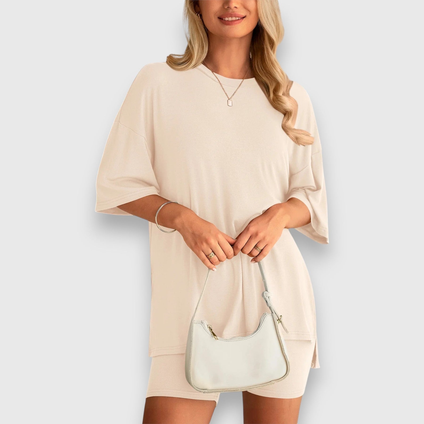 Das Kira-Set kombiniert ein oversized T-Shirt mit trendigen Radshorts mit hoher Taille – für einen stilvollen Look, der Komfort und Lässigkeit vereint. Egal, ob du dich zu Hause entspannst, unterwegs bist oder trainierst – dieses Outfit ist vielseitig und bietet unglaubliche Bewegungsfreiheit mit einem modernen Touch.