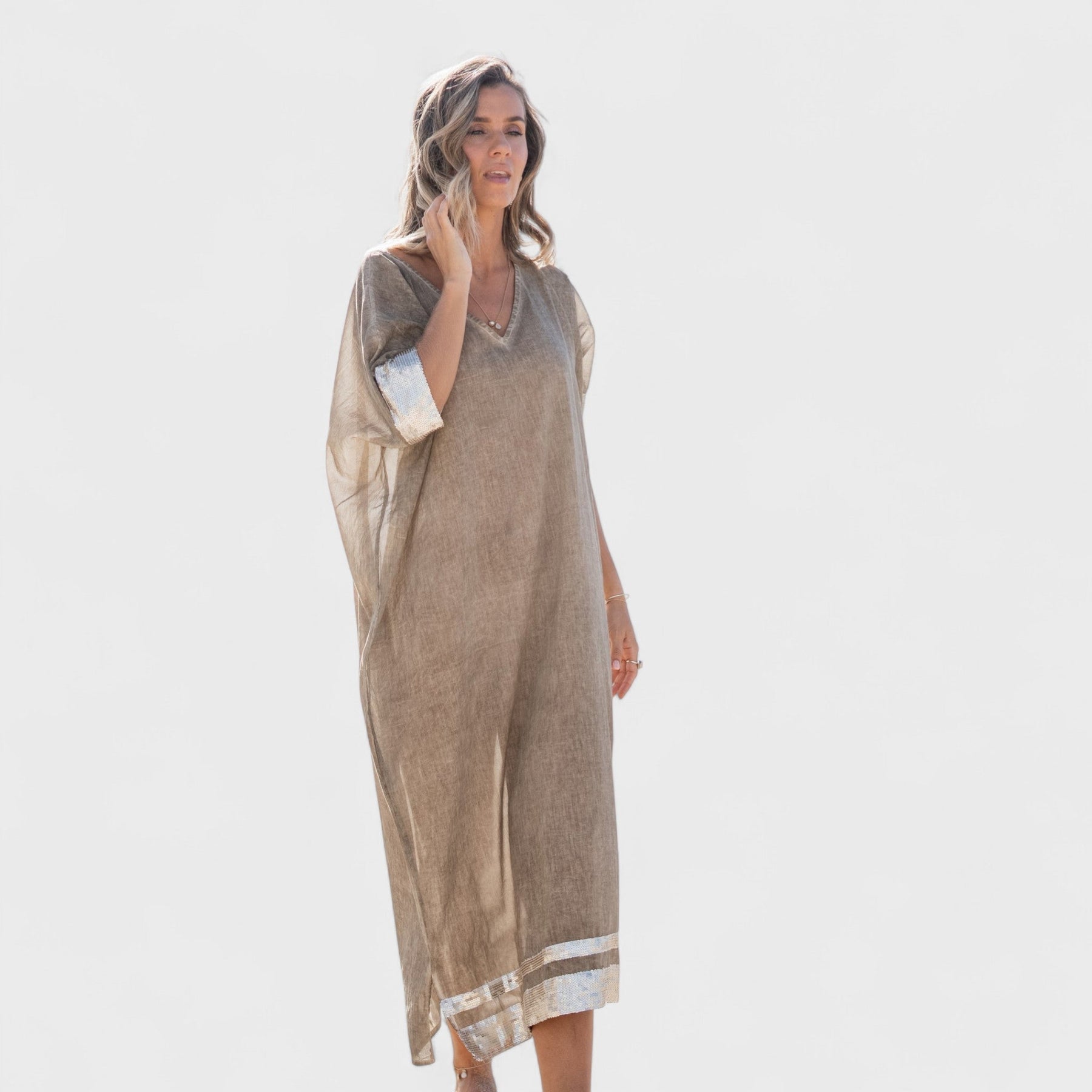 Diese luftigen Maxikleider sind die Essenz von sommerlicher Freiheit und natürlicher Eleganz. Der lockere Schnitt sorgt für absoluten Komfort, während die feinen Details an den Ärmeln und dem unteren Saum einen Akzent setzen, der sie zum perfekten Kleidungsstück macht, nicht nur für den Strand, sondern auch für Stadtspaziergänge oder einen Abenddrink. Es braucht nur einen einzigen Berührung, und Sie werden sie lieben.