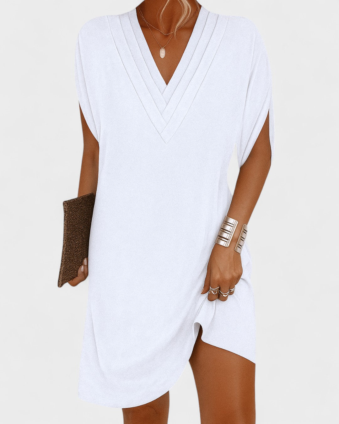 Leichtes, modernes und elegantes Kleid, das deine Figur mit Einfachheit und Charme betont. Der V-Ausschnitt mit geschichteten Details verleiht dem Kleid eine raffinierte Note, während die breiten Ärmel mit Schlitz an der Seite Luftigkeit und Frische in das Modell bringen. Ideal für informelle Anlässe, Abendessen oder als stilvolles Alltagsoutfit.