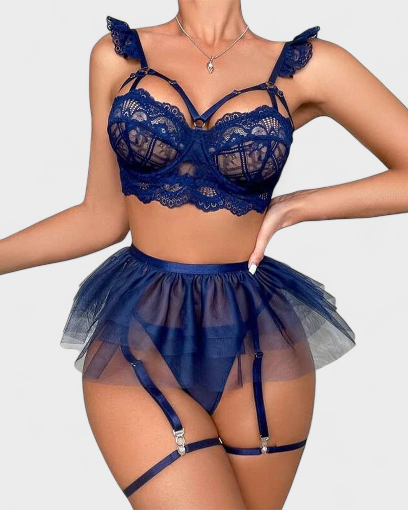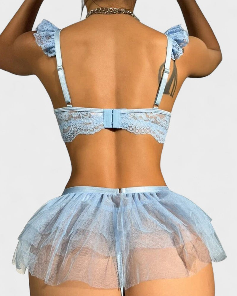 Ein einzigartiges Set, das romantische Spitze mit zartem Tüll und verführerischen Strümpfen kombiniert. Der BH mit Bügeln und dekorativen Bändern betont perfekt das Dekolleté, während der gestufte Rock aus durchscheinendem Material einen verspielten und femininen Touch verleiht. Dank der elastischen Bänder und durchdachten Details ist dieses Modell die ideale Wahl für besondere Anlässe.