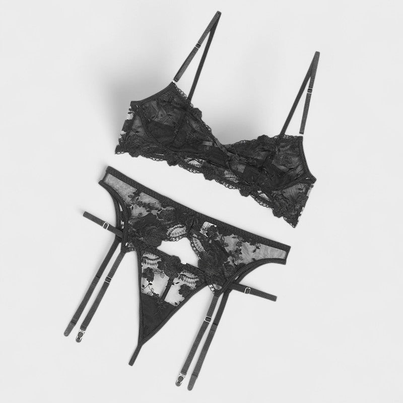 Entdecken Sie die perfekte Kombination aus Sinnlichkeit und Eleganz in diesem luxuriösen Unterwäsche-Set. Zarte durchsichtige Spitze mit floralen Stickereien wirkt raffiniert und gleichzeitig unwiderstehlich verführerisch. Der Bügel-BH bietet Halt und formt das Dekolleté schön, während die Slips mit Strumpfhalter Ihre weiblichen Kurven betonen. Dieses Set ist die ideale Wahl für besondere Anlässe und Momente, in denen Sie sich außergewöhnlich fühlen möchten.