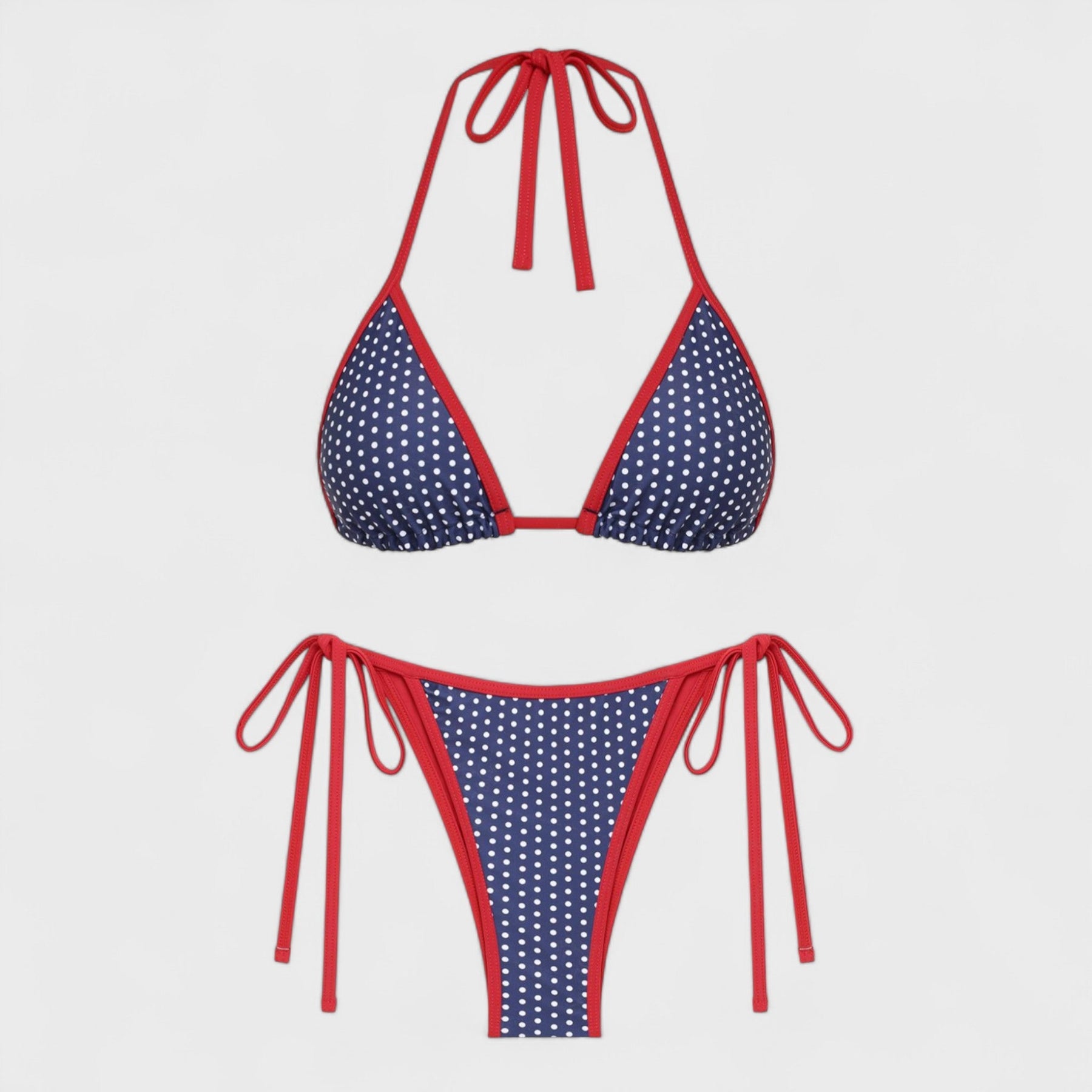Dieses dreieckige Bikini-Set mit einem feinen Muster und kontrastfarbigen Kanten ist der Inbegriff von gewagtem Stil und weiblichem Charme. Die Schnürung an den Seiten und im Nacken ermöglicht eine perfekte Anpassung an jede Figur und sorgt gleichzeitig für Komfort den ganzen Tag am Strand oder am Pool.