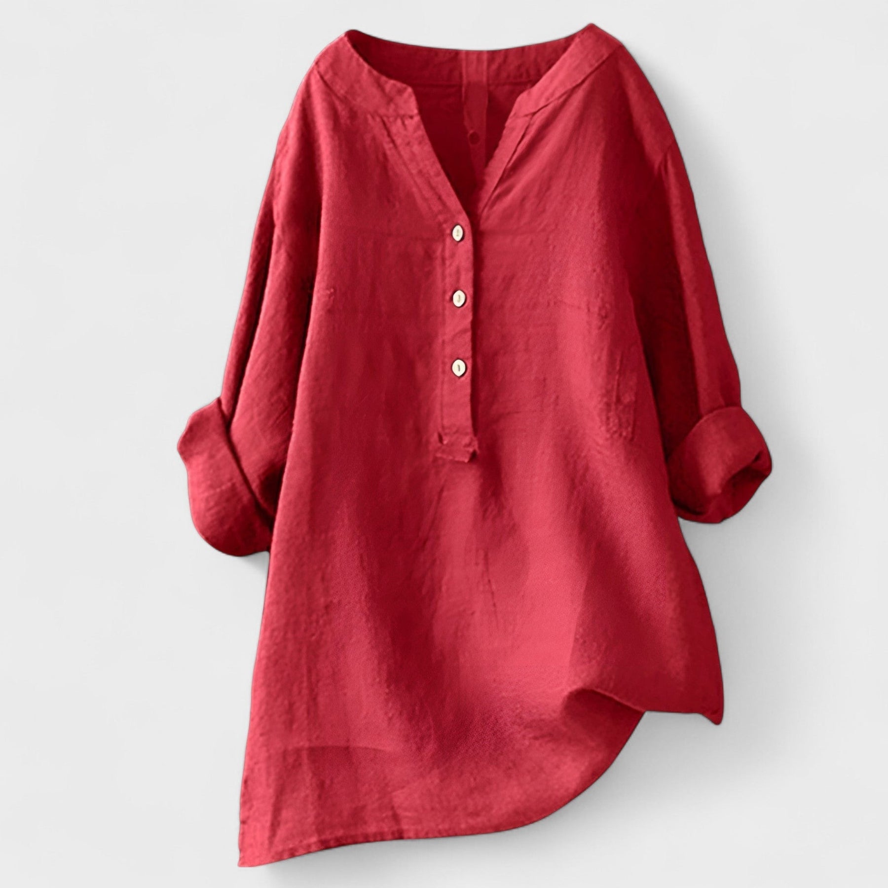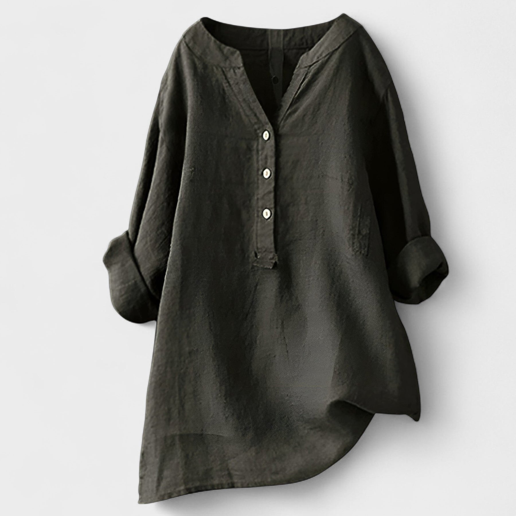 Dank des lockeren Schnitts und des leichten Materials ist dieses Hemd ideal für diejenigen, die sowohl Komfort als auch Stil in ihrer täglichen Garderobe schätzen. Der V-Ausschnitt mit Knöpfen an der Vorderseite verleiht einen Hauch von Eleganz, während die langen Ärmel, die hochgekrempelt werden können, das Hemd das ganze Jahr über tragbar machen. Ein echtes Basic für die Garderobe, das Lässigkeit mit Raffinesse vereint.