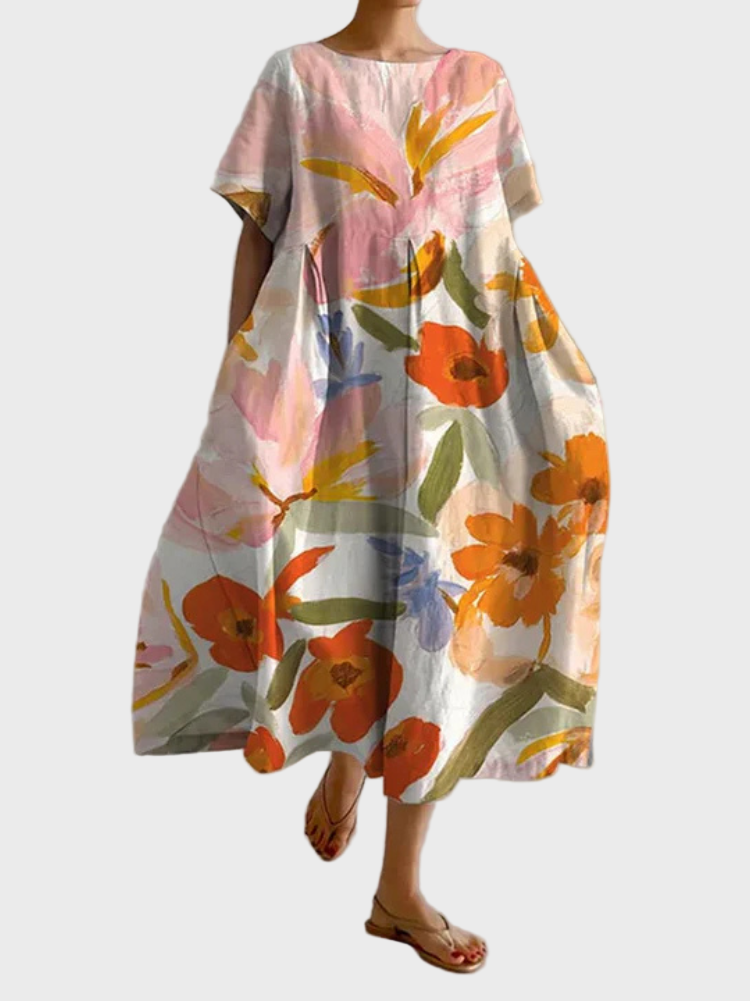 Das blühende Kleid ist ein Kleid, das an ein Kunstwerk erinnert, das mit Farben und Energie gefüllt ist. Auffällige Blumenmuster in Orange, Pink, Gelb und Blau schaffen ein beeindruckendes Aussehen, das Frische und Femininität ausstrahlt.